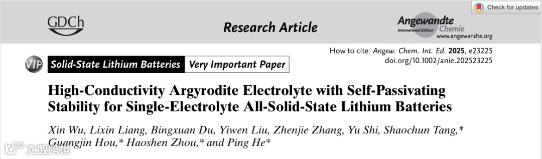 Xin Wu, Lixin Liang, Bingxuan Du, Yiwen Liu, Zhenjie Zhang, Yu Shi, Shaochun Tang*, Guangjin Hou*, Haoshen Zhou*, and Ping He*. High-Conductivity Argyrodite Electrolyte with Self-Passivating Stability for Single-Electrolyte All-Solid-State Lithium Batteries, Angew. Chem. Int. Ed. 2025, e23225.