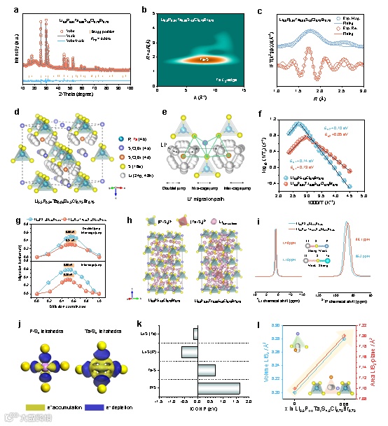 图3. Li5.5P0.94Ta0.06S4.5Cl0.75Br0.75电解质的晶体结构和离子输运性质探究。(a) Li5.5P0.94Ta0.06S4.5Cl0.75Br0.75的Rietveld精修图谱。(b) Li5.5P0.94Ta0.06S4.5Cl0.75Br0.75在Ta L₃边的连续小波变换EXAFS等高线图。k代表波数,R + ΔR表示径向距离,ΔR表示由于相位漂移引起的距离修正。(c) Li5.5P0.94Ta0.06S4.5Cl0.75Br0.75在Ta L₃边的傅里叶变换EXAFS拟合。蓝圈和红圈分别代表傅里叶变换实验EXAFS的幅度和实部。(d) Li5.5P0.94Ta0.06S4.5Cl0.75Br0.75电解质的有序晶体结构。(e) 从图3d提取的亚晶格,用于阐明Li+迁移路径。(f) Li5.5PS4.5Cl0.75Br0.75和Li5.5P0.94Ta0.06S4.5Cl0.75Br0.75的7Li自旋-晶格驰豫率与温度的关系。(g) 通过DFT计算的Li5.5PS4.5Cl0.75Br0.75和Li5.5P0.94Ta0.06S4.5Cl0.75Br0.75的Li+扩散能垒。(h) 基于300 K条件下的AIMD模拟,在1×1×2晶胞中Li5.5PS4.5Cl0.75Br0.75和Li5.5P0.94Ta0.06S4.5Cl0.75Br0.75的Li+概率密度分布。(i) Li5.5PS4.5Cl0.75Br0.75和Li5.5P0.94Ta0.06S4.5Cl0.75Br0.75的7Li和31P MAS NMR谱。(j) P-S4和Ta-S4四面体的差分电荷密度。(k) Li5.5P0.94Ta0.06S4.5Cl0.75Br0.75中Li-S和Ta-S键,以及Li5.5PS4.5Cl0.75Br0.75中Li-S和P-S键的ICOHP分析。(l) Ta5+取代引起Li(48h)-S4多面体体积膨胀和Li(24g)-S3三角形面积扩大。