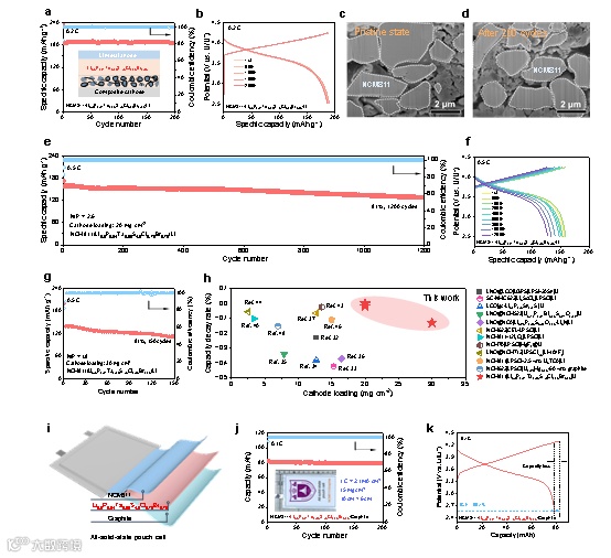 图6. 全固态电池的电化学性能。(a) NCM811/Li5.5P0.94Ta0.06S4.5Cl0.75Br0.75/Li电池在0.2C下的循环性能。(b) 不同循环次数下的充放电曲线。(c, d) 复合正极在初始和循环200次后的深度形貌。(e) 该电池在0.5C下,正极载量为20 mg cm-2、N/P比为2.6时的长循环。(f) 不同循环次数下相应的充放电曲线。(g) 该电池在0.5C下,更高正极载量(30 mg cm-2)和更低N/P比(1.8)下的循环性能。(h) 本工作与以前报道全固态电池的正极载量和单圈容量衰减率对比。(i) NCM811/Li5.5P0.94Ta0.06S4.5Cl0.75Br0.75/Graphite软包电池示意图。(j) 面积为10 cm × 6 cm、初始容量82.5 mAh的软包电池循环性能。(k) 软包电池的首圈恒电流充放电曲线。