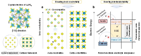 图1. (a) 通过成分调控提升电解质离子电导率的示意图。(b) 通过自钝化稳定策略实现电解质宽电化学稳定窗口的示意图。