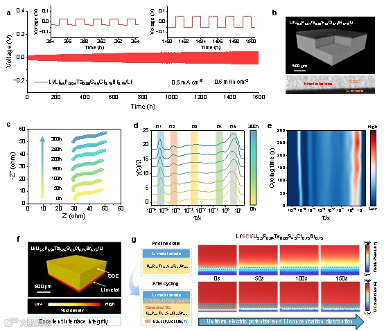 图5. Li/Li5.5P0.94Ta0.06S4.5Cl0.75Br0.75界面稳定性机理研究。(a) Li/Li5.5P0.94Ta0.06S4.5Cl0.75Br0.75/Li对称电池在0.5 mA cm-2和0.5 mAh cm-2下的恒电流Li+沉积/剥离曲线(插图为放大的恒电流曲线)。(b) 部分切除后相应的3D XR-CT重构图像以及虚线框区域的放大2D切片(底部)。(c-e) Li/Li5.5P0.94Ta0.06S4.5Cl0.75Br0.75/Li电池在0-300小时循环时间范围内的Nyquist图及相应的DRT分析。(f) Li/Li5.5P0.94Ta0.06S4.5Cl0.75Br0.75/Li对称电池循环300小时后的3D XR-CT重构图像。底部的红色区域代表锂负极,顶部的黄色区域对应固态电解质层。(g) 循环后Li/Li5.5P0.94Ta0.06S4.5Cl0.75Br0.75界面SEI生成示意图以及COMSOL Multiphysics模拟的工作电池中Li/Li5.5P0.94Ta0.06S4.5Cl0.75Br0.75界面电势和锂浓度随时间演变。