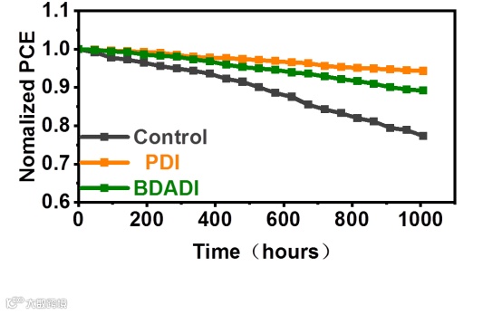 PDI钝化后器件在 1000小时后仍保持 95% 左右的初始效率;