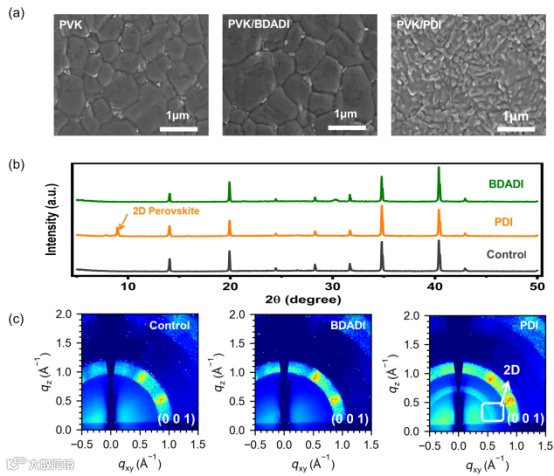 图1. (a) 对照、PDI和BDADI处理的钙钛矿薄膜的顶视SEM图,(b) XRD图谱和(c) GIWAXS图像。