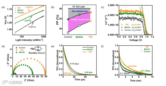 图6. (a) VOC与光强自然对数的关系图。(b) 器件FF限制由非辐射损失(灰色区域)和电荷传输损失(粉色区域)组成。空心和实心圆分别代表实测FF和无电荷传输损失的最大FF。(c) 器件的M-S图。(d) 器件的奈奎斯特图,插图为拟合电路。(e) TPC谱。(f) TPV谱。