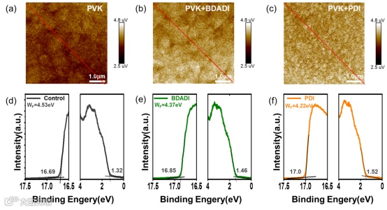图3. 对照(a)、BDADI (b) 和 PDI (c) 修饰的钙钛矿薄膜的KPFM图像。对照(d)、BDADI (e) 和 PDI (f) 修饰的钙钛矿薄膜的UPS能谱。