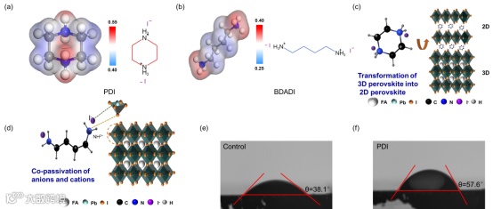 图2. 界面修饰引起的2D/3D PVK示意图。PDI (a) 和 BDADI (b) 的分子结构和静电势。使用PDI (c) 或 BDADI (d) 对钙钛矿薄膜进行后处理的示意图。原始 (e) 和 PDI钝化 (f) 钙钛矿薄膜的静态水接触角
