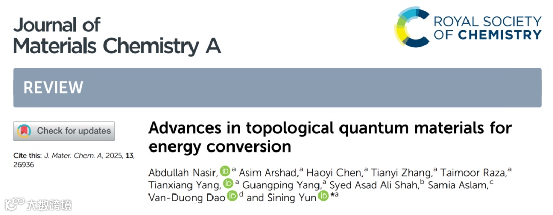 近日,来自西安建筑科技大学云斯宁教授“新能源材料”研究团队与合作者在国际知名期刊《Journal of Materials Chemistry A》上发表题为“Advances in topological quantum materials for energy conversion”的综述论文。云斯宁教授为论文通讯作者,外籍博士研究生Abdullah Nasir为论文第一作者,西安建筑科技大学为论文牵头完成单位,荷兰莱顿化学研究所、巴基斯坦COMSATS伊斯兰堡大学,越南菲尼卡大学等为国际合作完成单位。