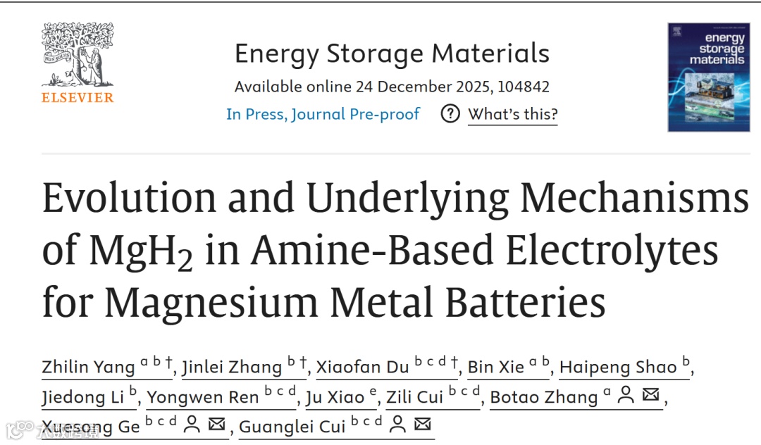近日,中国科学院青岛生物能源与过程研究所崔光磊研究员、葛雪松副研究员与青岛大学张波涛教授,在国际知名期刊Energy Storage Materials上发表题为“Evolution and Underlying Mechanisms of MgH2 in Amine-Based Electrolytes for Magnesium Metal Batteries”的研究论文。该工作针对胺基电解液中界面化学机制认识不足的问题,将吡咯烷(PYR)引入Mg(TFSI)2/DME体系中,通过调控Mg2+的配位环境,成功构建了富含 MgH2的稳定固态电解质界面(SEI)。研究表明,PYR 的引入不仅有效抑制了醚溶剂和 TFSI阴离子的副反应分解,还显著削弱了钝化层的持续生长,促进了镁的均匀沉积。在此基础上,所组装的Mg//Mg电池,在0.3 mA cm2的电流密度下实现了超过1000小时的稳定循环,极化电压显著降低,电化学性能明显优于对比体系。更重要的是,研究团队合成了氘代吡咯烷,并结合氘水滴定及在线气体分析–质谱联用技术,直接证实了界面产物MgH2的存在。同位素标记与示踪实验进一步表明,PYR直接参与了负极界面 MgH2的形成过程。理论计算结果显示,MgH2相较于传统无机 SEI组分具有更低的 Mg2+迁移与脱溶剂化能垒,有利于界面离子传输。该研究从实验与理论层面系统揭示了 MgH2在胺基电解液中的演化规律及其功能作用,为高性能镁金属电池电解液与界面设计提供了新的思路和理论依据。