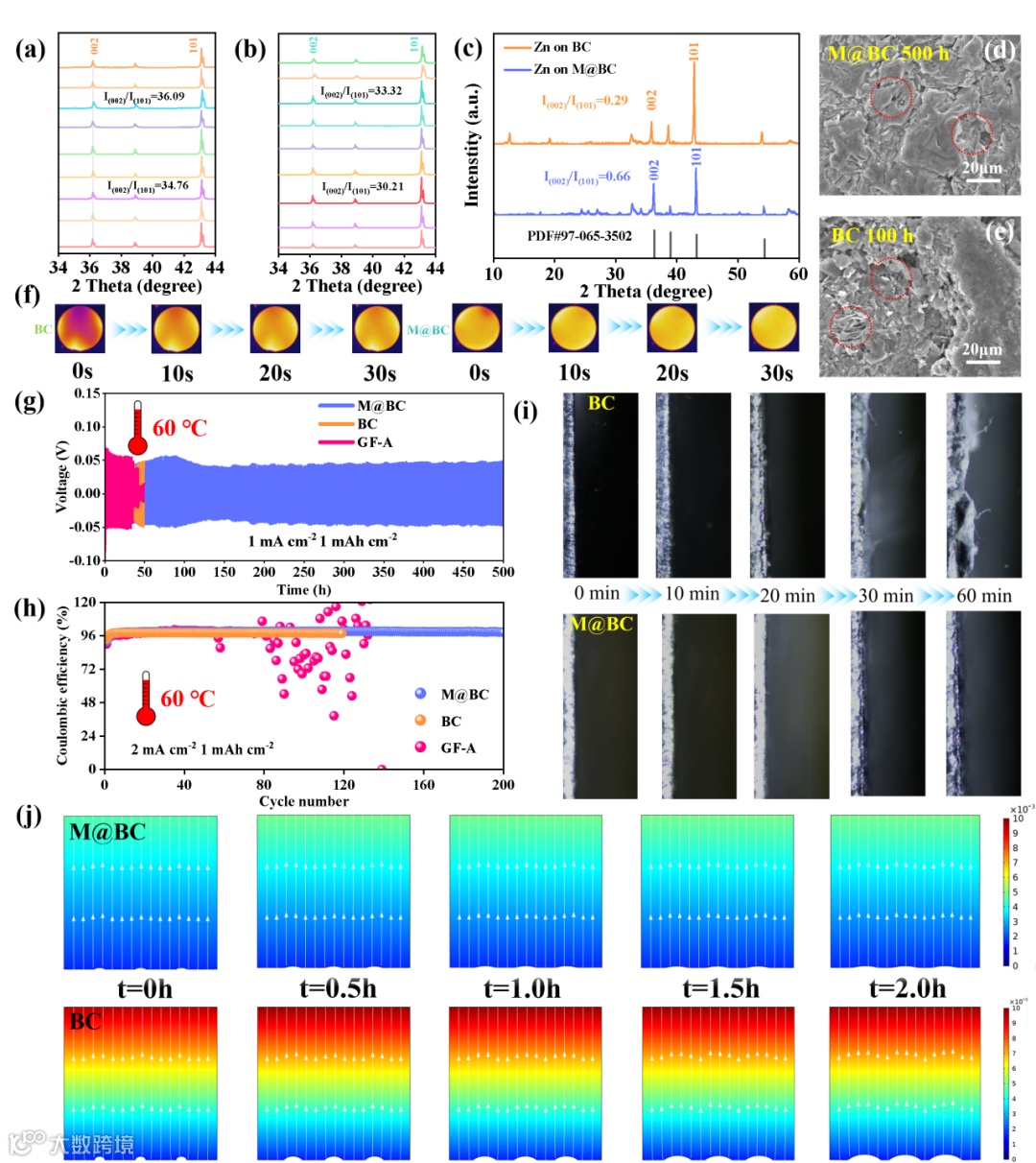 图2. 多功能复合隔膜在室温与高温条件下协同调控锌负极界面演化与沉积行为,通过均匀电场分布和定向Zn2+传输实现致密、均匀枝晶锌沉积。