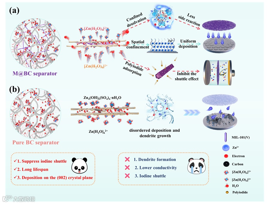 在“双碳”目标背景下,面向大规模储能应用,人们对电池体系提出了更高要求——不仅要安全可靠,还要成本可控、环境友好。水系锌-碘电池凭借高安全性、较高理论容量以及丰富廉价的原材料,被视为极具前景的储能选择。然而在实际运行中,锌负极易出现枝晶生长、析氢等副反应,正极侧多碘化物穿梭问题突出,导致电池效率下降、寿命缩短,且在高温等苛刻条件下问题进一步加剧。作为电池中常被忽视却至关重要的组成部分,隔膜在离子传输调控和界面稳定中扮演着“第三电极”的角色。传统隔膜功能单一,难以兼顾锌离子沉积调控与多碘化物抑制,因此,发展同时具备限域效应、去溶剂化调节和界面匹配能力的多功能隔膜,被认为是实现锌-碘电池宽温域稳定运行的关键突破口。