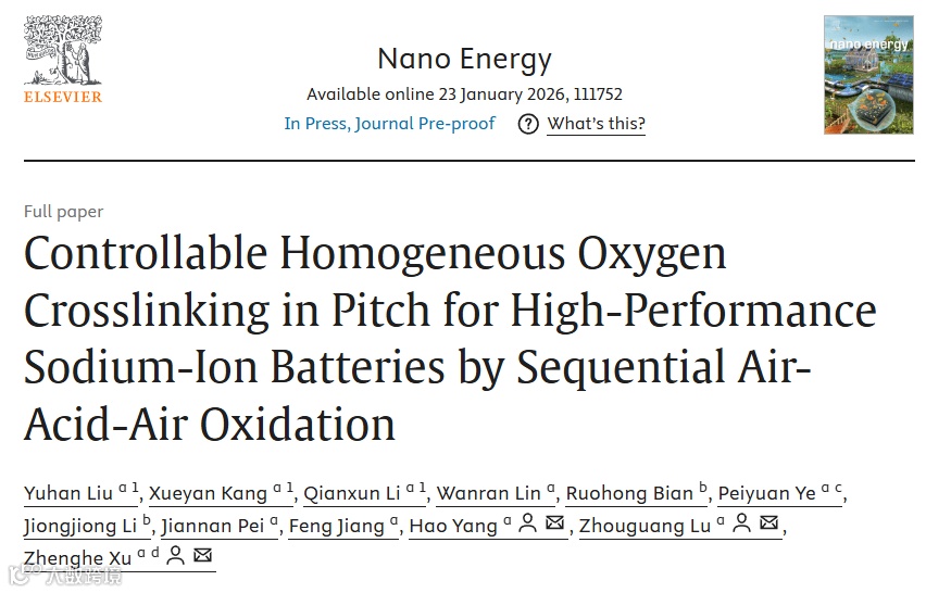 近日,来自南方科技大学的徐政和院士与卢周广教授合作,在国际知名期刊Nano Energy上发表题为“Controllable Homogeneous Oxygen Crosslinking in Pitch for High-Performance Sodium-Ion Batteries by Sequential Air-Acid-Air Oxidation”的研究论文。该研究论文提出了一种顺序空气–酸–空气(AAA)脉冲预氧化策略,实现低软化点石油沥青的均匀氧交联与孔结构可控演化,突破硬碳平台容量与初始库仑效率难以兼顾的瓶颈,并验证了其在钠离子电池负极中的高容量与超长循环稳定性。