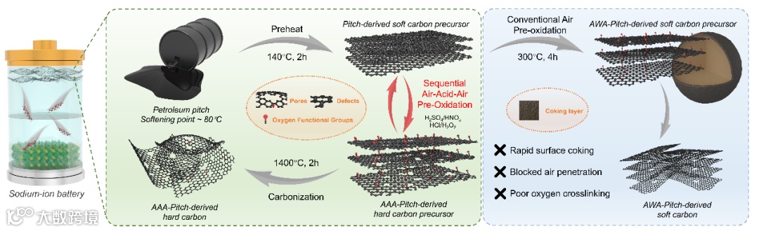 顺序空气–酸–空气氧化实现沥青中可控均匀氧交联,构筑高性能钠离子电池负极材料