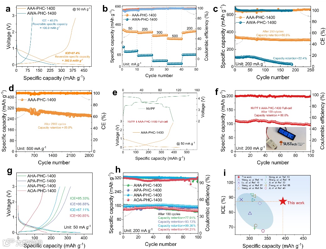 图3. AAA沥青基硬碳的半电池电化学性能:(a)AWA-PHC-1400与AAA-PHC-1400负极在50 mA g-1下的首圈恒流充放电(GCD)曲线;(b,c)倍率性能与短期循环性能;(d)AAA-PHC-1400负极的长循环性能;(e,f)NVPF正极与AAA-PHC-1400负极在50 mA g-1下的GCD曲线,以及NVPF||AAA-PHC-1400全电池的循环性能;(g)不同氧化剂处理得到的AAA沥青基硬碳在50 mA g-1下的GCD曲线;(h)对应的循环性能;(i)AAA-PHC-1400半电池性能的文献对比