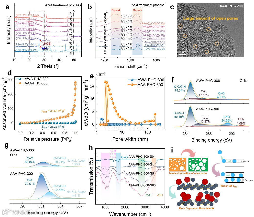 图2. AAA预氧化机理示意图:(a,b)AAA-PHC-300 的 XRD 谱图与拉曼光谱;(c)AAA-PHC-300-S120 的HR-TEM图像;(d,e)AWA-PHC-300 与 AAA-PHC-300 的 N2 吸附–脱附等温线及孔径分布;(f,g)AWA-PHC-300 与 AAA-PHC-300 的C 1s和O 1s 高分辨 XPS 谱;(h)ATR-FTIR 光谱及(i)酸处理机制示意图