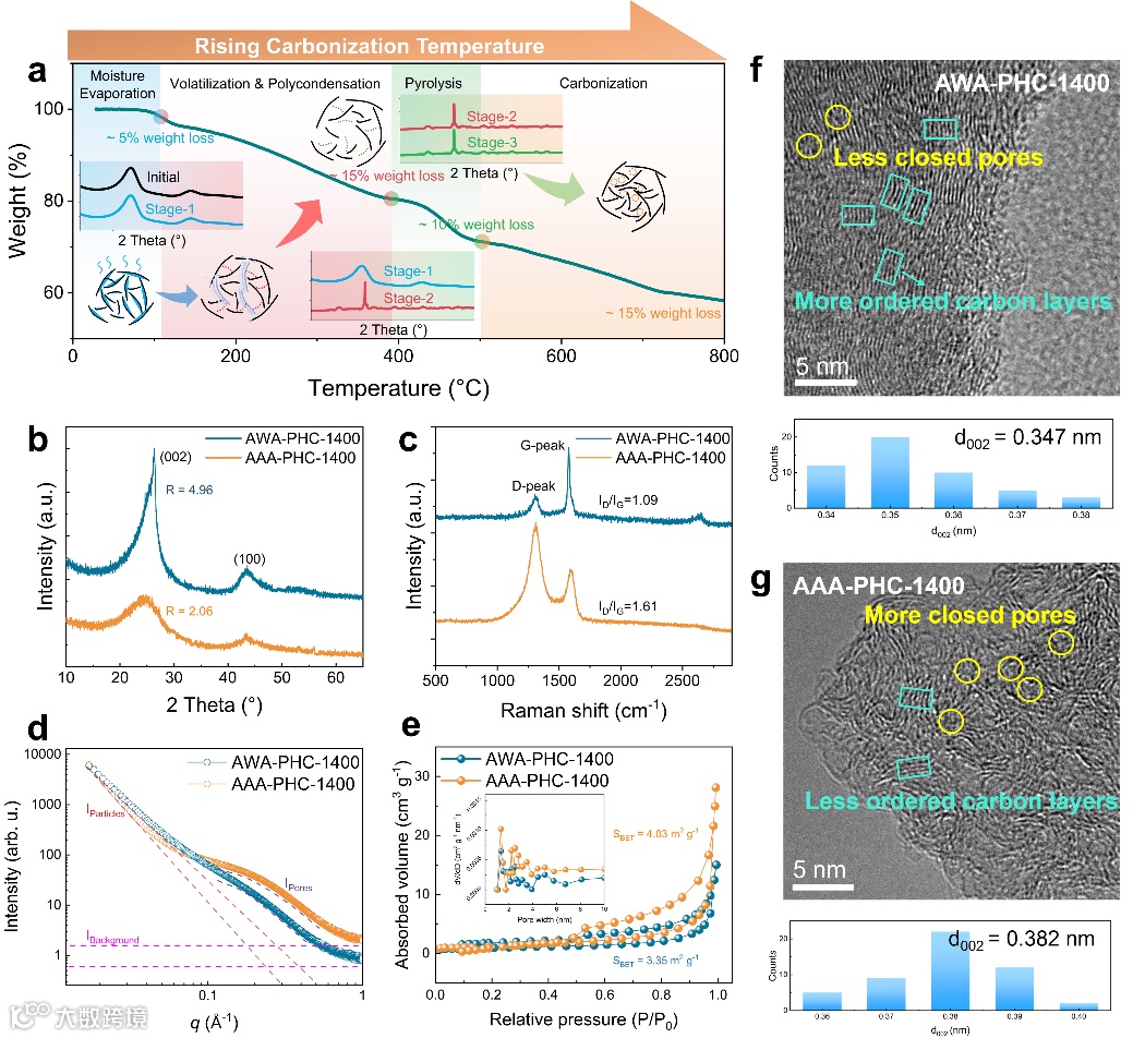 图1. AAA序列预氧化沥青衍生硬碳的结构与物理性质表征:(a)空气气氛下沥青的热重(TG)曲线(插图为对应样品的XRD谱图);(b)XRD衍射谱图;(c)Raman光谱;(d)SAXS曲线;(e)N2吸附–脱附等温线(插图为孔径分布);(f,g)AWA-PHC-1400与AAA-PHC-1400的高分辨透射电镜(HR-TEM)图像及对应层间距
