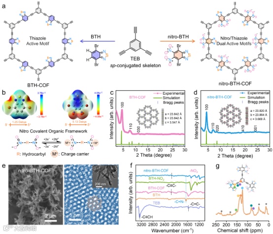 通过引入强吸电子的硝基苯并噻二唑活性单元与高导电性的炔键桥联结构,形成硝基苯并噻二唑共价有机框架(nitro-BTH-COF),高密度硝基/噻唑活性位点和高度离域π-共轭体系,确保了多重双电子硝基/噻唑位点具有高NH4+可及性(利用率达95.2%)和低活化能(25.93 kJ mol−1)。