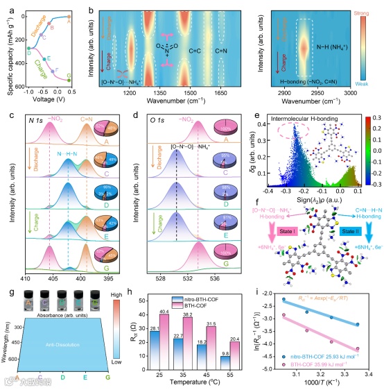 密度泛函理论计算证实了“先硝基、后噻唑”的两步12 e−氧化还原反应机制。分子动力学模拟进一步证实,硝基/噻唑基团与NH4+在界面形成了高密度氢键网络,促进nitro-BTH-COF负极稳定的电荷存储。