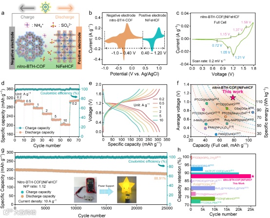 以nitro-BTH-COF为负极,高电压普鲁士蓝类似物(NiFeHCF)为正极构建了铵离子全电池,实现了高能量密度(86.1 Wh kg−1)和长循环寿命(25,000次充放电循环后容量保持率为88.91%)。该工作为通过多电子硝基功能化与sp共轭结构协同设计共价有机框架,构筑高性能、长寿命铵离子电池负极材料提供了新的视角。