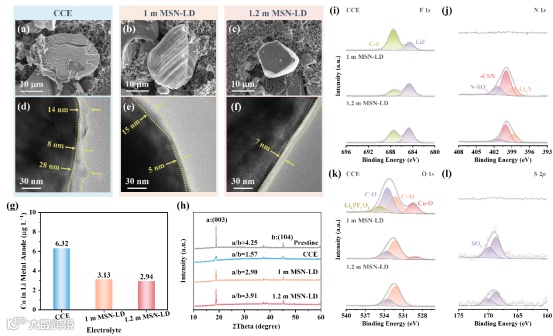 图6. 在LCO||Li电池中,使用(a)CCE、(b)1 m MSN-LD和(c)1.2 m MSN-LD电解质的循环后LCO正极的SEM图像。使用(d)CCE、(e)1 m MSN-LD和(f)1.2 m MSN-LD电解质的电池循环50次后LCO正极的TEM图像。(g)循环50次后锂金属负极中Co元素的ICP-OES分析。(h)循环后LCO正极的XRD图谱。循环50次后LCO正极的(i)F 1s、(j)N 1s、(k)O 1s和(l)S 2p XPS谱图。