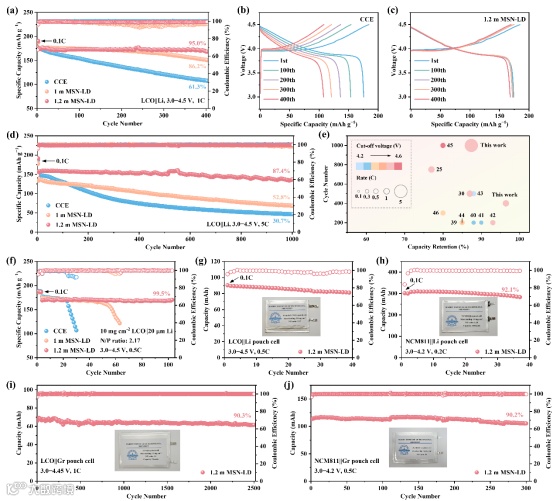 图4. (a)1C倍率和(d)5C倍率下LCO||Li电池的循环性能。采用(b)CCE和(c)1.2 m MSN-LD电解质的LCO||Li电池的典型充放电曲线。(e)已报道的DEEs和深共熔聚合物电解质在LCO||Li电池中的性能对比。(f)正极载量为10 mg cm-2的LCO||Li全电池在0.5C倍率下的循环性能。(g)LCO||Li软包电池、(h)NCM811||Li软包电池、(i)LCO||Gr软包电池和(j)NCM811||Gr软包电池的循环性能。插图为对应软包电池的光学照片。