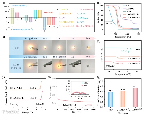 图1. (a)本工作所制备电解质的粘度与离子电导率,与已报道的深共熔电解质(DEEs)进行对比。(b)热重分析曲线。(c)对商业碳酸酯电解质(CCE)和1.2 m MSN-LD进行点火测试的光学图像。(d)MSN、1 m MSN-LD和1.2 m MSN-LD的差示扫描量热曲线。(e)通过线性扫描伏安法表征的DEEs的氧化稳定性。(f)使用1.2 m MSN-LD电解质的Li||Li对称电池在5 mV极化电压下的计时电流曲线,插图为极化前后的电化学阻抗谱。(g)不同电解质中的锂离子迁移数。