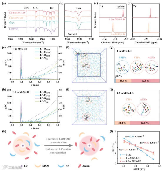 图2. (a, b)LiDFOB、MSN、1 m MSN-LD和1.2 m MSN-LD的傅里叶变换红外光谱。1 m MSN-LD和1.2 m MSN-LD的(c)7Li和(d)19F核磁共振谱。(e)1 m MSN-LD和(h)1.2 m MSN-LD的径向分布函数及配位数结果。(f)1 m MSN-LD和(i)1.2 m MSN-LD的分子动力学模拟快照。(g)1m MSN-LD和(j)1.2m MSN-LD中基于分子动力学模拟的溶剂分离离子对、接触离子对及聚集体典型溶剂化结构的定量结果。(k)阴离子诱导的溶剂化结构形成示意图。(l)基于阿伦尼乌斯公式得出的Li||Li对称电池中负极界面处Li+脱溶剂化活化能。
