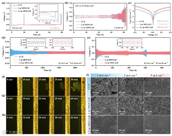 图3. (a)通过Aurbach法在0.5 mA cm-2下测得的Li||Cu电池的平均库伦效率。(b)在不同电流密度下、面容量为1 mAh cm-2的Li||Li电池的电压曲线。(c)塔菲尔曲线。(d)在0.2 mA cm-2和0.2 mAh cm-2下以及(e)在0.5 mA cm-2和0.5 mAh cm-2下Li||Li电池的循环稳定性。在0.5 mA cm-2下(f)CCE、(g)1 m MSN-LD和(h)1.2 m MSN-LD电解质中锂沉积过程的原位光学显微镜图像。(i)Li||Li电池在不同电流密度下循环50次后(面容量为1 mAh cm-2)的锂金属扫描电镜图像。