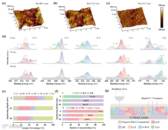 图5. 采用(a)CCE、(b)1 m MSN-LD和(c)1.2 m MSN-LD电解质的LCO||Li电池循环50次后锂金属负极表面的原子力显微镜图像。(d)采用1.2 m MSN-LD电解质的电池循环50次后锂金属负极的XPS深度剖析谱。(e)C、O、F、B、N、S和Li元素沿溅射深度的原子百分比。(f)基于F 1s和N 1s谱图得出的SEI组分相对浓度。(g)1.2 m MSN-LD电解质形成的SEI结构示意图。