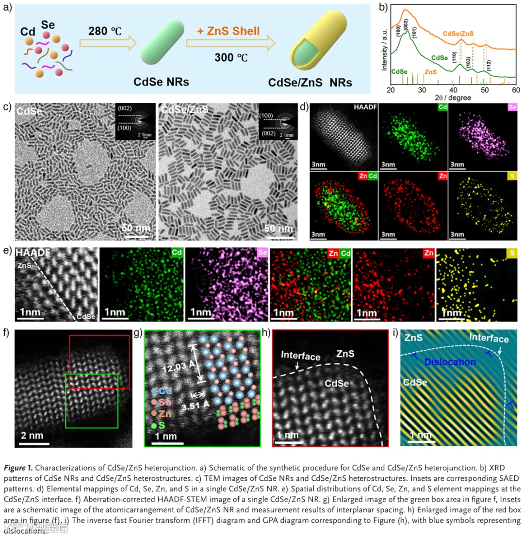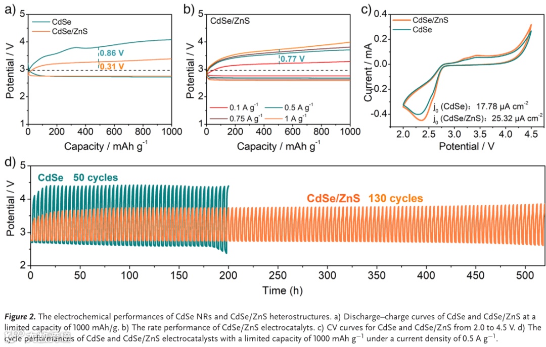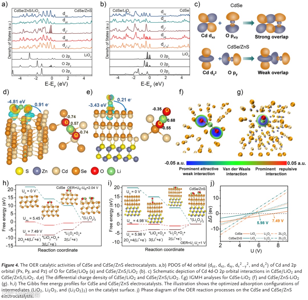 北京理工大学李红博等人为探究活性位点与中间体间的轨道相互作用本质,考虑到Cd 4d轨道能级适中且易于调控,设计了一种基于CdSe纳米棒的催化剂作为模型系统,深入研究Cd 4d态与反应中间体的轨道相互作用,并阐明其对OER活性的影响。实验结果表明,从CdSe纳米棒到CdSe/ZnS纳米棒的Cd 4d电子态调控会引发其与LiO2轨道相互作用模式的转变,这一结论得到了理论计算的支持。具体而言,与CdSe和LiO2之间强烈的Cd 4dxy –O 2Px/y轨道相互作用模式相比,在CdSe/ZnS–LiO2体系中观察到的较弱4dz2 – O 2py轨道相互作用模式降低了限速步骤的活化能,从而提升了OER催化活性。需要指出的是,尽管已有研究报道异质结构催化剂用于Li–O2电池以增强OER性能,但大多数研究通常将此增强归因于异质界面处的内建电场优化了反应中间体的吸附强度。然而,这些研究尚未在轨道层面阐明内置电场调控中间体吸附行为的内在机制。本研究阐明了催化剂活性位点与中间体之间轨道相互作用的本质,为设计Li-O2电池中的电催化剂提供了重要指导。