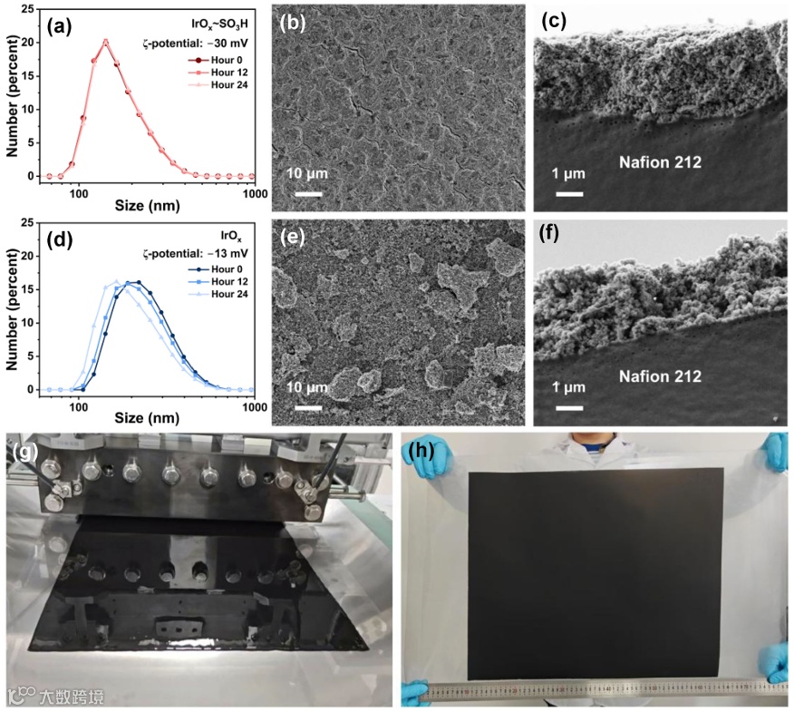 在催化剂墨水制备过程中,我们观察到Ir/IrOx~SO3H相较于Ir/IrOx在静置后更不易发生沉降。为探究其分散行为,我们通过Zeta电位和动态光散射(DLS)对催化剂颗粒的聚集状态进行了分析(图5a和5d)。结果表明,磺酸基团的引入使催化剂具有更小的平均粒径和显著提升了催化剂墨水的储存稳定性。进一步地,SEM图像显示Ir/IrOx~SO3H所形成催化层的表面形貌更加均匀、致密(图5b-c和5e-f)。最终,我们成功实现了大面积膜电极的制备,其结果进一步凸显了Ir/IrOx~SO3H催化剂在工业级质子交换膜水电解应用中的巨大潜力(图5g-h)。