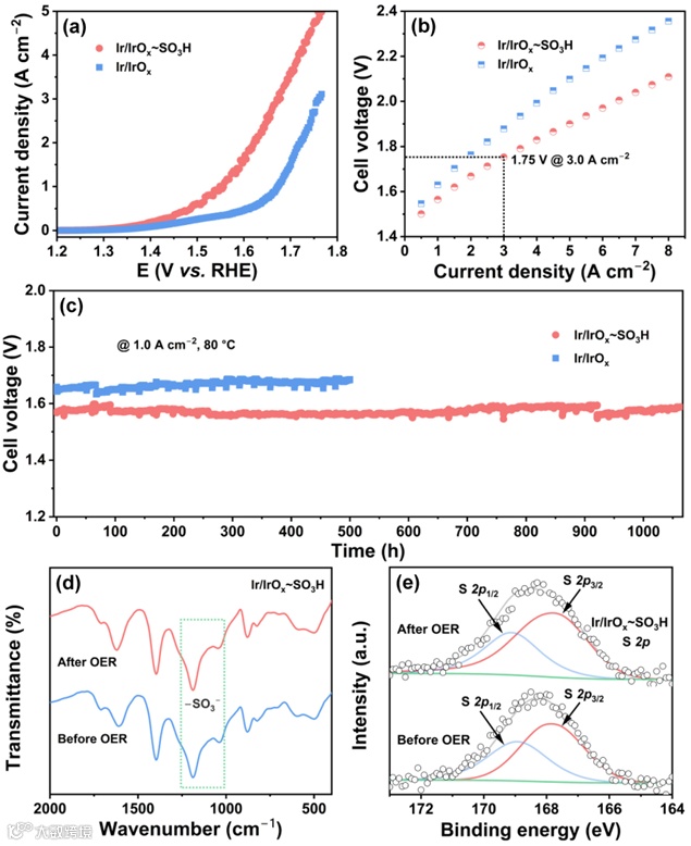 图3:电催化性能及析氧反应(OER)后的稳定性研究。(a)Ir/IrOx~SO3H与Ir/IrOx催化剂在80 °C、0.5 mol L−1硫酸溶液中的线性扫描伏安法(LSV)曲线;(b)分别以Ir/IrOx~SO3H和Ir/IrOx为阳极组装的质子交换膜水电解槽(PEMWEs)的极化曲线;(c)两种阳极组装的PEMWE在1.0 A cm−2电流密度下的计时电位曲线(进水温度控制在80 °C,Ir/IrOx~SO3H-PEMWE的实测欧姆电阻为24.9 ± 0.1 mΩ,Ir/IrOx-PEMWE为23.4 ± 0.1 mΩ);(d)Ir/IrOx~SO3H催化剂OER前后的傅里叶变换红外光谱(FTIR);(e)OER前后的S 2p X射线光电子能谱(XPS)。