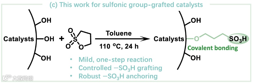 图1:(c)本工作中−SO3H接枝催化剂的合成示意图。