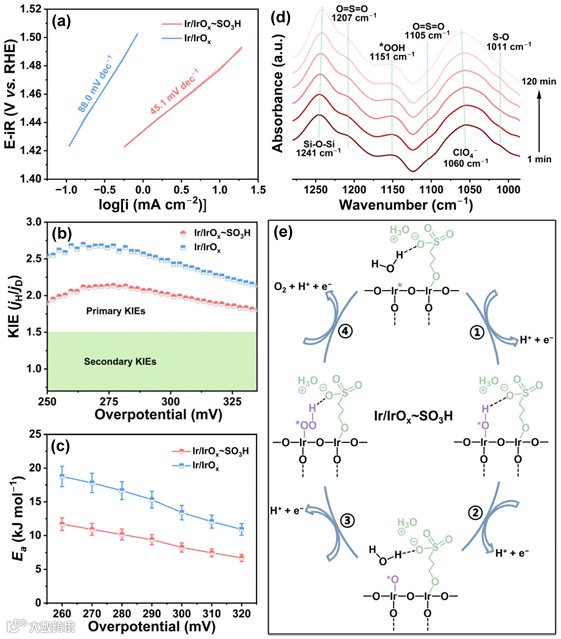图4:析氧反应(OER)增强机理分析。(a)塔菲尔曲线、(b)动力学同位素效应(KIE)值与过电位的关系、(c)活化能(Ea)值与过电位的关系(均经iR校正,误差棒代表标准差,n = 3次独立实验),所有测试(塔菲尔斜率、KIE、Ea)采用三电极体系,电解液:塔菲尔与Ea测试用0.5 mol L−1硫酸,KIE测试用0.5 mol L−1硫酸和0.5 mol L−1氘代硫酸;(d)Ir/IrOx~SO3H催化剂在0.1 mol L−1高氯酸溶液中、1.55 V下,原位衰减全反射表面增强红外吸收光谱(ATR-SEIRAS)随测试时间的谱线;(e)Ir/IrOx~SO3H表面析氧反应(OER)机理示意图。