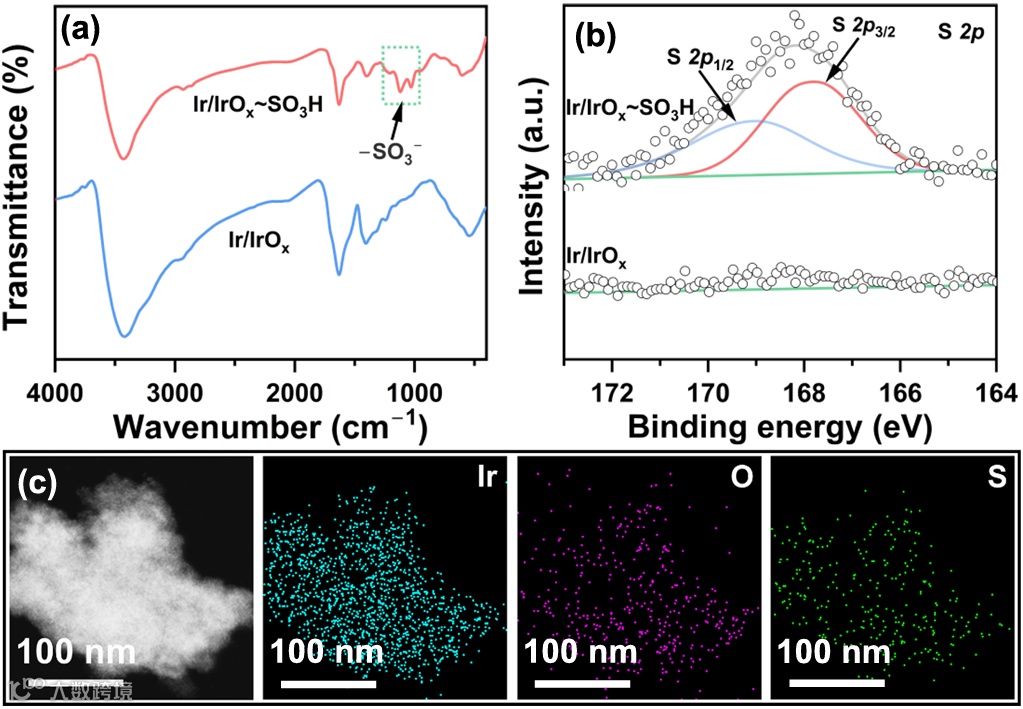 图2:催化剂的结构表征。(a)Ir/IrOx~SO3H和Ir/IrOx催化剂的傅里叶变换红外光谱(FTIR);(b)S 2p X射线光电子能谱(XPS);(c)Ir/IrOx~SO3H催化剂的能量色散X射线光谱(EDS)元素分布图。