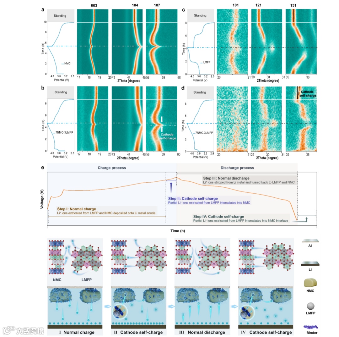 在放电过程中,Li⁺ 离子首先从锂金属负极剥离,并重新嵌入 LMFP 与 NMC 的晶格中(步骤 III)。在放电末期,同样会发生 CSC 行为,即部分 Li⁺ 从 LMFP 中脱嵌并嵌入相邻 NMC 的界面结构中,而非返回锂金属负极(步骤 IV)。这一过程通过轻微的 Li⁺ 脱嵌,使完全放电状态下的 LMFP 具备更优的动力学特性。不能排除 CSC 行为在整个充放电过程中持续存在的可能性,仍需进一步深入研究。