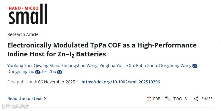 近日,安徽工业大学朱磊博士、汪冬红教授及柳东明教授团队在国际知名期刊《Small》上发表题为“Electronically Modulated TpPa COF as a High-Performance Iodine Host for Zn-I2 Batteries ”的研究工作。该工作针对水系锌碘电池的核心技术瓶颈,系统阐明了官能团类型、孔径调控与碘吸附量和利用率之间的构效关系,深入揭示了电子结构工程对多碘化物限域与反应动力学的协同作用机制。