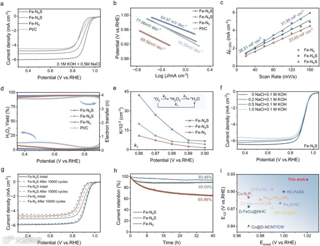 图3. 催化剂在碱性海水ORR中的催化性能。