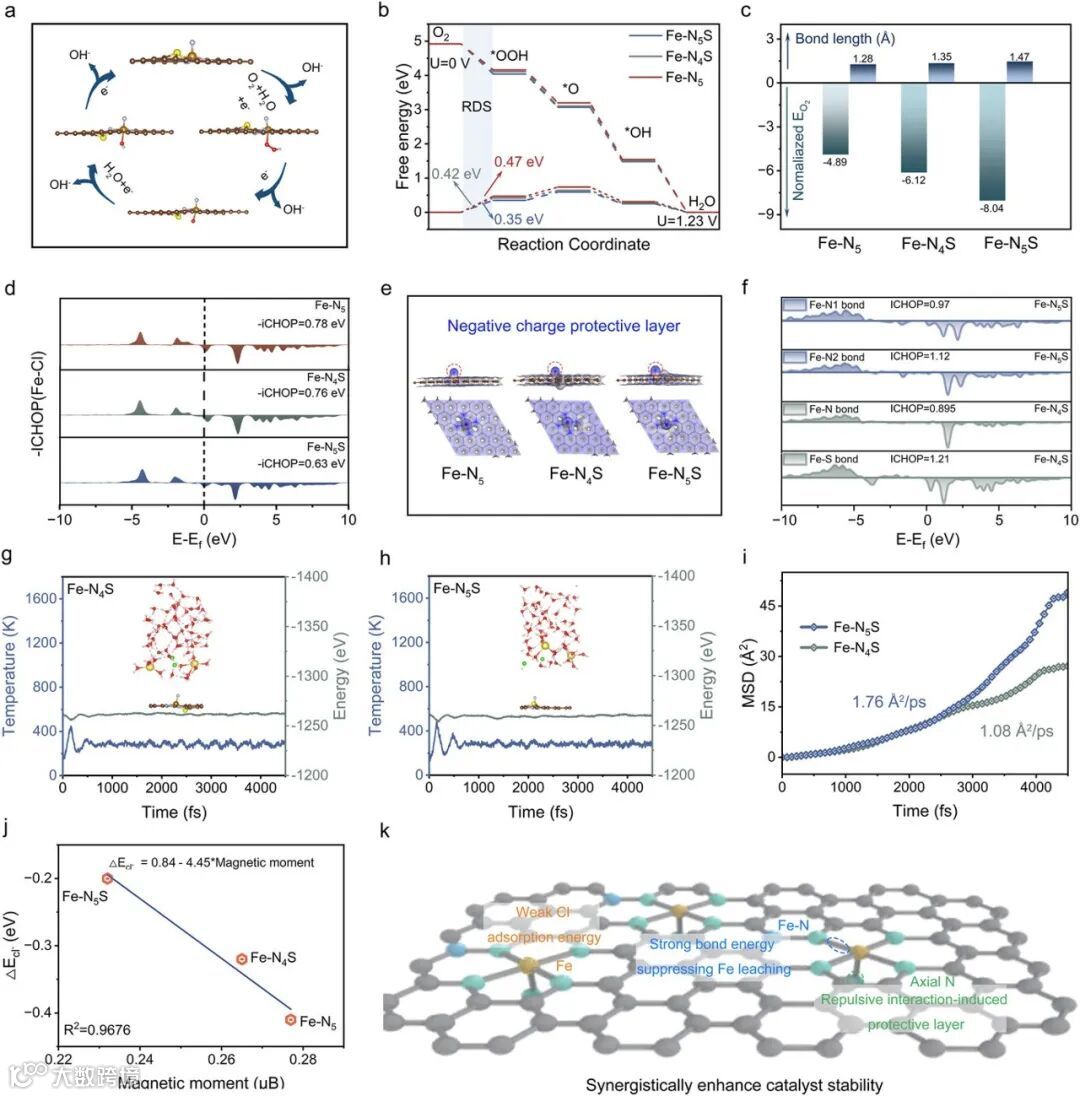 原位表征和密度泛函理论都揭示了增强催化活性和抗Cl-特性的机制。在海水电解质中,第二壳层配位S不仅通过优化Fe活性位点的吸附能和的Fe-N键强度来提高催化活性和稳定性。更重要的是,首次提出“轴壳协同优化”这一概念,即第二壳层配位的协同作用促进了Fe向轴向N的电荷转移。这形成了一个围绕轴向N的增强的负电荷保护屏障,有效地抵御了Cl-的腐蚀,为海水ORR领域催化剂的稳定性提升提供了新的视角和方法。