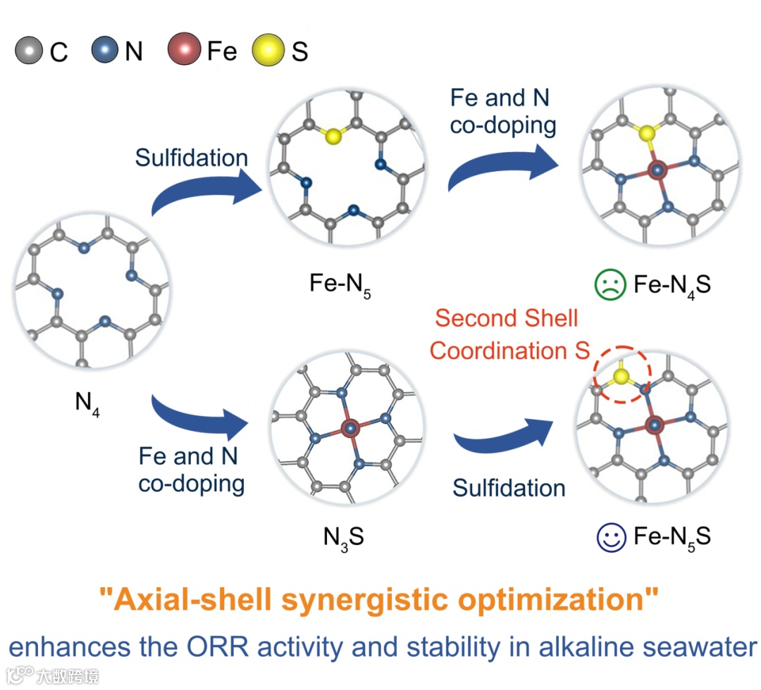 近日,来自哈尔滨工程大学的贺飞,孙琪琪和刘志亮在国际知名期刊Advanced Functional Materials上发表题为“Engineering Controllable Coordination Shells of Axial Single Atoms for Tuning Oxygen Reduction Reaction in Alkaline Seawater Electrolytes”的文章。在本研究中,报道了一种通过调控原子配位顺序以实现对轴向配位Fe单原子配位壳层环境精确调控的策略,成功将S分别掺入轴向配位FeN5催化剂的第一配位壳层(FeN4S)和第二配位壳层(FeN5S)。同时,结合原位拉曼光谱和密度泛函理论计算,进一步阐明了由壳层-轴向协同效应调控的海水电解质中催化活性增强和Cl⁻耐受性的内在机制。此外,将FeN5S催化剂用作铝-空气海水电池的阴极催化剂,出色的功率密度和比容量展示了其在实际应用中的价值。