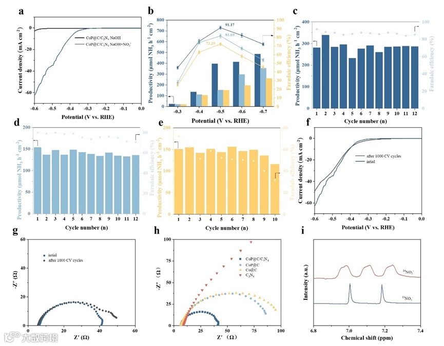 (a) 在有无NO2-溶液中,CoP@C/C3N4的LSV曲线;(b) 不同材料在1 M NaOH + 0.1 M NO2-溶液中,氨产率和法拉第效率;(c-e)在1 M NaOH + 0.1 M NO2-溶液中,电解电位为-0.5 V vs. RHE,CoP@C和Co@C的氨产率和法拉第CoP@C效率,共12个循环;(f) 1000次CV循环前后,1M NaOH + 0.1M NO2-溶液中CoP@C/C3N4的LSV曲线;(g) 1000次CV循环前后,1 M NaOH + 0.1 M NO2-溶液中的CoP@C/C3N4阻抗;(h) 不同材料在1 M NaOH + 0.1 M NO2-溶液中的阻抗图,(i) 电解液液体15N核磁共振谱。