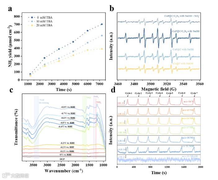 (a) CoP@C/C3N4在1 M NaOH + 0.1 M NO2-溶液中,电位为-0.5 V vs. RHE,与添加不同量TBA后的RHE相比,氨产率随时间变化;(b) 1 M NaOH 溶液中不同材料的 EPR 曲线,以及 1 M NaOH + 0.1 M NO2-溶液中 CoP@C/C3N4在-0.5 V vs.RHE电位下的EPR曲线;(c) 在不同电位下,1 M NaOH + 0.1 M NO2-溶液中对CoP@C/C3N4进行原位红外光谱;(d) 使用CoP@C/C3N4在1 M NaOH + 0.1 M -NO2-溶液中,在-0.5 V vs. RHE的条件下,对不同产物进行原位质谱。