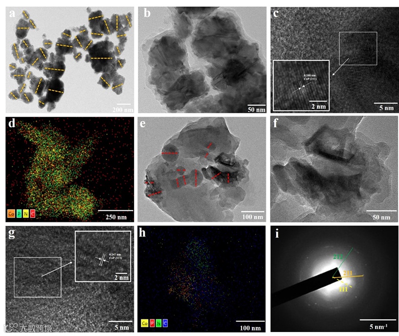 (a, b)不同放大倍率下的CoP@C透射电子显微镜图像;(c) CoP@C的HRTEM图像;(d) CoP@C的EDS元素映射图像;(e, f)不同放大倍率下的CoP@C/C3N4透射电镜图像;(g) CoP@C/C3N4的HRTEM图像;(h) CoP@C/C3N4的EDS元素映射图像;(i) CoP@C/C3N4的SAED图像