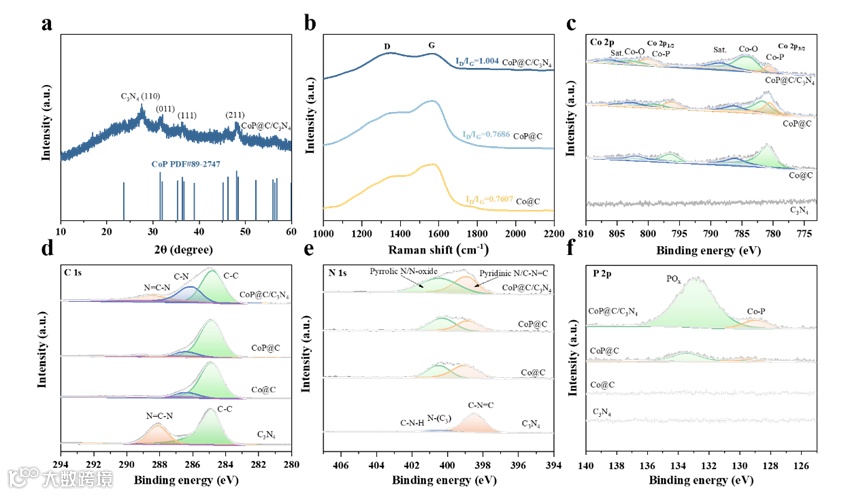 (a)CoP@C/C3N4的XRD谱;(b)CoP@C/C3N4的拉曼光谱与对比样品的比较;(c-f)对CoP@C/C3N4、CoP@C、Co@C和C3N4的高分辨率XPS光谱,包括(c)Co-2p谱、(d)C1s谱、(e)N1s谱和(f)P 2p谱。