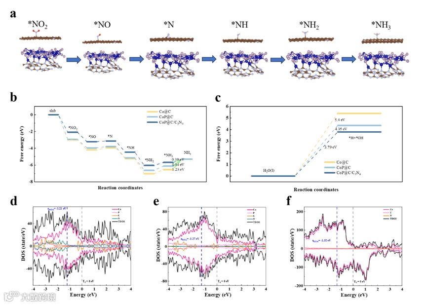 (a) eNO2RR过程中CoP@C/C3N4亚硝酸盐还原途径示意图;(b)CoP@C/C3N4、CoP@C和Co@C表面eNO2RR过程的吉布斯自由能图;(c) CoP@C/C3N4、CoP@C和Co@C水电解的吉布斯自由能图;(d-f)CoP@C/C3N4、CoP@C和Co@C的态密度(DOS)图。