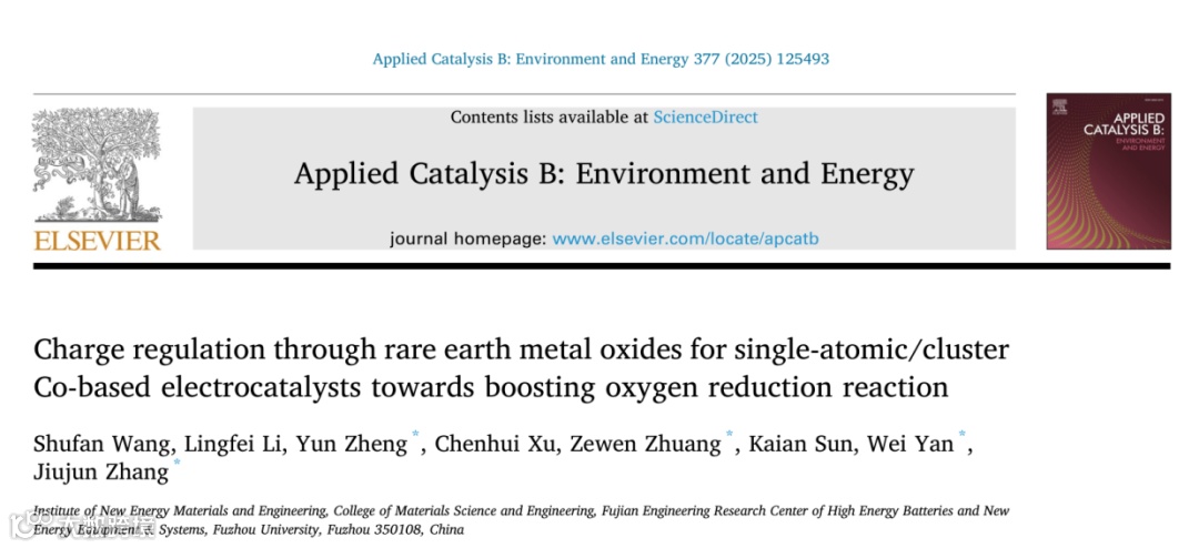 S. Wang, L. Li, Y. Zheng*, C. Xu, Z. Zhuang*, K. Sun, W. Yan*, J. Zhang*, “Charge Regulation Through Rare Earth Metal Oxides for Single-Atomic/Cluster Co-Based Electrocatalysts Towards Boosting Oxygen Reduction Reaction”, Appl. Catal. B Environ 2025, 377, 125493.