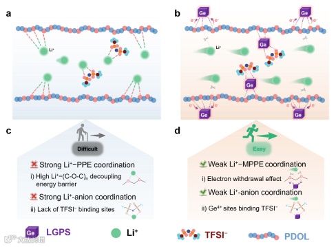(1)新型“微环境调控”电解质设计:作者提出了一种区别于传统聚合物结构改性的新型策略——通过在聚醚电解质中引入Ge4+位点,调控聚合物主链周围的局部微环境。该方法不依赖复杂的聚合物分子结构设计,具备工艺简便、适应性强等优势,为突破固态聚合物电解质中Li⁺迁移能垒问题提供了新的解决路径。