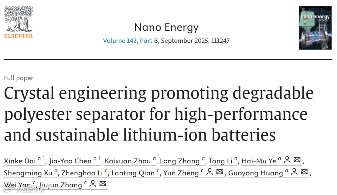 X. Dai, J. Chen, K. Zhou, L. Zhang, T. Li, H. Ye*, S. Xu, Z. Li, L. Qian, Y. Zheng*, G. Huang*, W. Yan, J. Zhang*, “Crystal Engineering Promoting Degradable Polyester Separator for High-Performance and Sustainable Lithium-Ion Batteries”, Nano Energy 2025, 142, 111247.