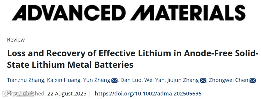 T. Zhang, K. Huang, Y. Zheng*, D. Luo, W. Yan, J. Zhang*, Z. Chen*, “Loss and Recovery of Effective Lithium in Anode-Free Solid-State Lithium Metal Batteries”, Adv. Mater. 2025, e05695.