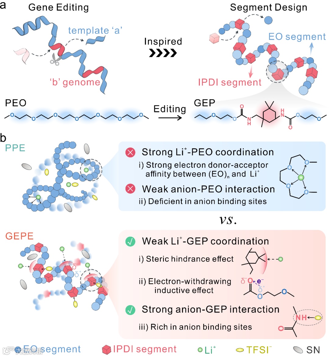 (1)新型仿生“基因编辑”策略:受到“基因编辑”原理的启发,作者提出了一种新型DEPE设计范式,通过靶向替换含醚氧的聚合物链段为功能性异佛尔酮二异氰酸酯(IPDI)衍生基团,构建了具有定制分子结构的“基因编辑”聚合物电解质。这种设计巧妙地利用IPDI基团的环脂族空间位阻效应和电子诱导效应,显著削弱Li⁺-聚合物氧基团的强配位作用,同时通过氢键供体位点强化阴离子捕获能力。