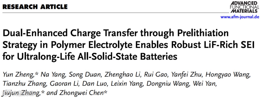 Y. Zheng*, N. Yang, S. Duan, Z. Li, R. Gao, Y. Zhu, H. Wang, T. Zhang, G. Li, D. Luo, L. Yang, D, Wang, W. Yan, J. Zhang*, Z. Chen*. “Dual-Enhanced Charge Transfer through Prelithiation Strategy in Polymer Electrolyte Enables Robust LiF-Rich SEI for Ultralong-Life All-Solid-State Batteries”, Adv. Funct. Mater. 2025, e11011.
